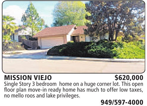 MISSION VIEJO $620,000 Single Story3bedroom home on ahugecornerlot.Thisopen floor plan move-in ready home has much tooffer low taxes, no mello roos and lake privileges.