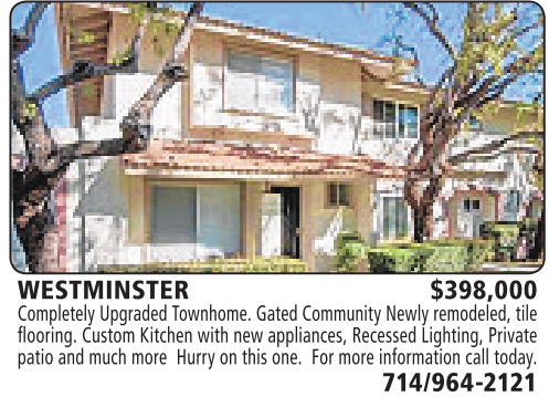 WESTMINSTER $398,000 Completely Upgraded Townhome. Gated Community Newly remodeled, tile flooring. Custom Kitchen with new appliances, Recessed Lighting, Private patio and much more Hurry on this one. For more information call today. 714/964-2121 See also