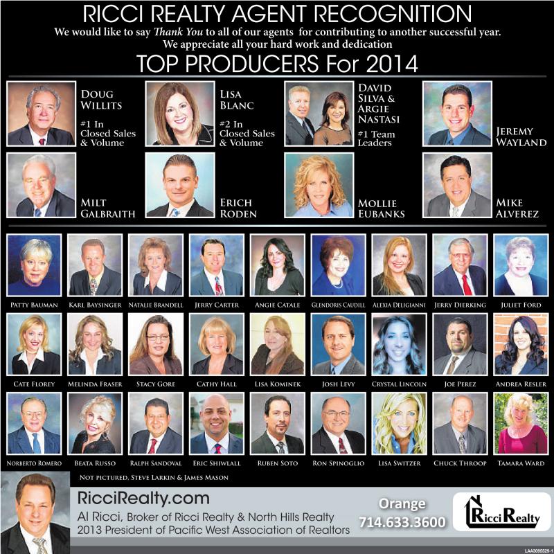 RICCI REALTY AGENT RECOGNITION We would like to say Thank You to all of our agents for contributing to another successful year. We appreciate all your hard work and dedication DOUG WILLITS #1 In Closed Sales & Volume TOP PRODUCERS For 2014 LISA BLANC #2 In Closed Sales & Volume DAVID SILVA & ARGIE NASTASI #1 Team Leaders JEREMY WAYLAND MILT GALBRAITH ERICH RODEN MOLLIE EUBANKS MIKE ALVEREZ Patty Bauman Karl Baysinger Natalie Brandell Jerry Carter Angie Catale Glendoris Caudill Alexia Deligianni Jerry Dierking Juliet Ford Cate Florey Melinda Fraser Stacy Gore Cathy Hall Lisa Kominek Josh Levy Crystal Lincoln Joe Perez Andrea Resler Norberto Romero Beata Russo Ralph Sandoval Eric Shiwlall Ruben Soto Ron Spinoglio Lisa Switzer Chuck Throop Tamara Ward Not pictured, Steve Larkin & James Mason RicciRealty.com Al Ricci, Broker of Ricci Realty & North Hills Realty 2013 President of Pacific West Association of Realtors Orange 714.633.3600 LAA3095529-1