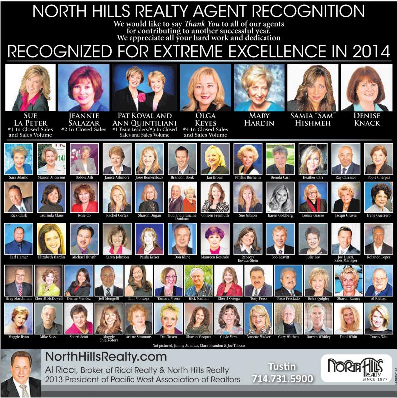 NORTH HILLS REALTY AGENT RECOGNITION We would like to say Thank You to all of our agents for contributing to another successful year. We appreciate all your hard work and dedication RECOGNIZED FOR EXTREME EXCELLENCE IN 2014 Sue La Peter #1 In Closed Sales and Sales Volume Jeannie Salazar #2 In Closed Sales Pat Koval and Ann Quintiliani #1 Team Leaders/#3 In Closed Sales and Sales Volume Olga Keyes #4 In Closed Sales and Sales Volume Mary Hardin Samia “Sam” Hishmeh Denise Knack Sara Adamo Marion Anderson Bobbie Ash Janice Ashmore Josie Bomersback Brandon Bonk JanBrown Phyllis Burhenn Brenda Carr Heather Carr RayCarrasco Popie Cherpas Rick Clark Laurinda Claus Rose Co Rachel Cortez Sharon Dugan Bud and Francine Colleen Freimuth Sue Gibson Karen Goldberg Louise Grasso Jacqui Graves Irene Guerrero Dunham Earl Hamer Elizabeth Hardin Michael Huynh Karen Johnson Paula Keiser Don Kline Maureen Kosinski Rebecca Bob Leavitt Julie Lee Joe Liuzzi, Rolando Lopez Kovacs-Stein Sales Manager Greg Marchman Cheryll McDowell Denise Mendez Jeff Mongelli Erin Montoya Tamara Myers Rick Nathan Cheryl Ortega Tony Perez Paco Preciado Belva Quigley Sharon Ramey Al Riebau Maggie Ryan Mike Sasso Sherri Scott Maggie Shiels-Mora Arlene Simmons Dee Tuxen Sharon Vasquez Gayle Verst Nanette Walker GaryWathen Darren Whitley Dani Whitt Tracey Witt Not pictured, JimmyAthanas, Clara Brandon &Joe Tilocco NorthHillsRealty.com Al Ricci, Broker of Ricci Realty & North Hills Realty Tus n 714.731.5900 2013 President of Pacific West Association of Realtors SINCE 1977