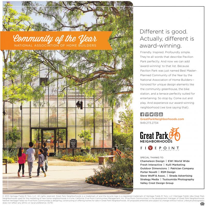 © 2013 Heritage Fields El Toro, LLC. All rights reserved. Great Park Neighborhoods is a trademark of and the bicycle logo is a registered trademark of Heritage Fields El Toro, LLC (Heritage Fields) dba Great Park Neighborhoods used for the marketing of new home neighborhoods in Irvine, California. Five Point Communities Management, Inc. (Five Point Communities) is the development manager of Great Park Neighborhoods. Neither Heritage Fields nor Five Point Communities is designing, constructing or offering homes for sale in Great Park Neighborhoods. All proposed amenities are subject to change without notice. Lifestyle photography does not reflect any ethnic or racial preference. (3/15)