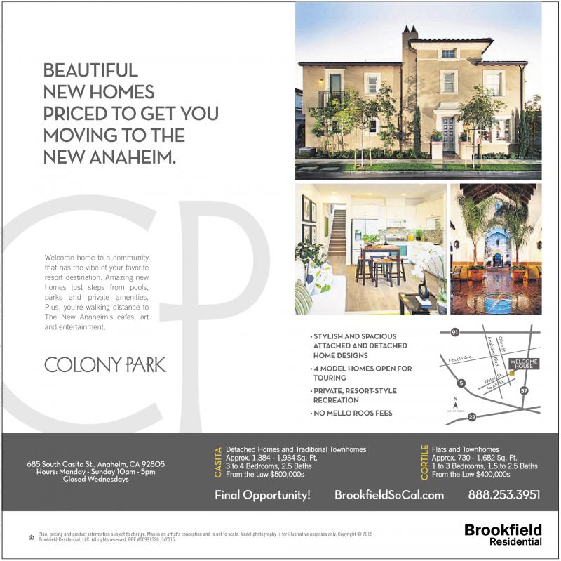 BEAUTIFUL NEW HOMES PRICED TO GET YOU MOVING TO THE NEW ANAHEIM. Welcome home to a community that has the vibe of your favorite resort destination. Amazing new homes just steps from pools, parks and private amenities. Plus, you’re walking distance to The New Anaheim’s cafes, art and entertainment. •STYLISH AND SPACIOUS ATTACHED AND DETACHED HOME DESIGNS •4MODEL HOMES OPEN FOR TOURING •PRIVATE, RESORT-STYLE RECREATION •NOMELLOROOS FEES 91 N5 MAP NOT TO SCALE 22 WELCOME HOUSE 57 685 South Casita St., Anaheim, CA 92805 Hours: Monday -Sunday 10am-5pm Closed Wednesdays Detached Homes and Traditional Townhomes Approx. 1,384 - 1,934 Sq. Ft. 3 to 4 Bedrooms, 2.5 Baths From the Low $500,000s Flats and Townhomes Approx. 730 - 1,682 Sq. Ft. 1 to 3 Bedrooms, 1.5 to 2.5 Baths From the Low $400,000s Final Opportunity! BrookfieldSoCal.com 888.253.3951 Plan, pricing and product information subject to change. Map is an artist’sconception and is not to scale. Model photography is for illustrative purposes only.Copyright ©2015 Brookfield Residential, LLC. All rights reserved. BRE #00991326. 3/2015. 10