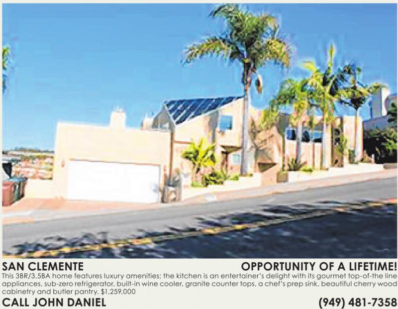 SAN CLEMENTE OPPORTUNITY OF A LIFETIME! This 3BR/3.5BA home features luxury amenities; the kitchen isanentertainer’s delight with its gourmet top-of-the line appliances, sub-zero refrigerator, built-in wine cooler, granite counter tops, achef’s prep sink, beautiful cherrywood cabinetry and butler pantry.$1,259,000 CALL JOHN DANIEL (949) 481-7358