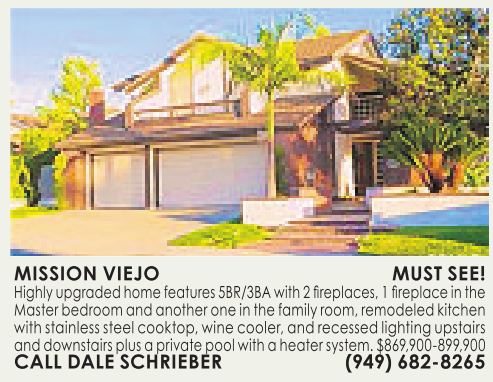 MISSION VIEJO MUST SEE! Highly upgradedhome features 5BR/3BAwith2fireplaces, 1fireplace in the Master bedroomand another one in thefamilyroom, remodeledkitchen with stainlesssteel cooktop, winecooler,and recessed lighting upstairs and downstairs plus aprivate poolwith aheatersystem. $869,900-899,900 CALL DALE SCHRIEBER (949) 682-8265 See also