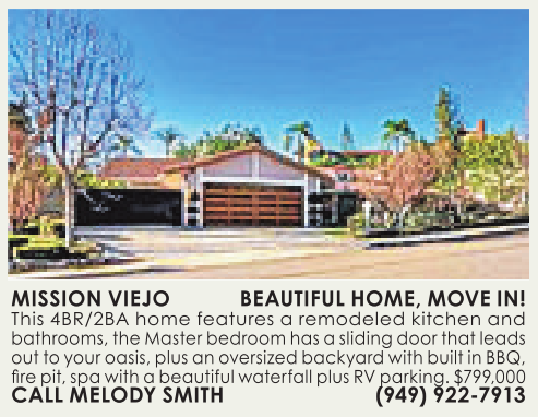 MISSION VIEJO BEAUTIFUL HOME, MOVE IN! This 4BR/2BA home features aremodeled kitchen and bathrooms, theMaster bedroomhas aslidingdoorthatleads outtoyouroasis, plus an oversized backyard with built in BBQ, firepit,spa with abeautifulwaterfall plus RV parking.$799,000 CALL MELODY SMITH (949) 922-7913 See also