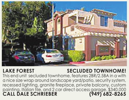 LAKE FOREST SECLUDED TOWNHOME! Thisend unit secluded townhome, features 2BR/2.5BA in awith anicesizewraparound landscape yard/patio,securitysystem, recessed lighting,granite fireplace,private balcony, custom painting,Italian tile,and 2car direct access garage.$340,000 CALL DALE SCHRIEBER (949) 682-8265