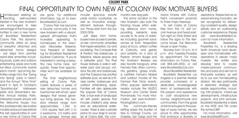 “Colony Park has become a favorite community in the new Anaheim with a vibrant, upbeat atmosphere that’s incredibly appealing to homebuyers in the area,” said Mercedes Meserve, vice President of Marketing for Brookfield Residential Southern California. “If you’re interested in owning a beautiful new home here, act quickly. These final opportunities won’t be available for long.”