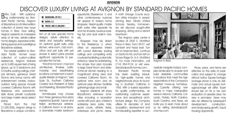 Calif. - with outstanding craftsmanship by Standard Pacific Homes, Avignon at Blackstone is alimited-edition collection of brand new luxury homes in Brea. Now selling, Avignon presents an impressive array of all new, estate-caliber home designs, expansive entertaining spaces and aprestigious Blackstone address.