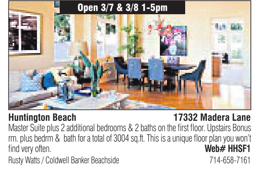 Huntington Beach Open 3/7 &3/8 1-5pm 17332 Madera Lane Rusty Watts /Coldwell Banker Beachside 714-658-7161 MasterSuite plus2additional bedrooms &2baths on the firstfloor.UpstairsBonus rm. plus bedrm & bath for atotalof3004sq.ft.Thisisaunique floorplan you won’t find very often. Web# HHSF1