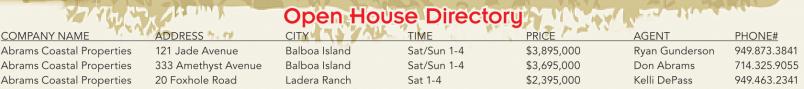 COMPANY NAME ADDRESS CITY TIME PRICE AGENT PHONE# Abrams Coastal Properties 121 Jade Avenue Balboa Island Sat/Sun 1-4 $3,895,000 Ryan Gunderson 949.873.3841 Abrams Coastal Properties 333 Amethyst Avenue Balboa Island Sat/Sun 1-4 $3,695,000 Don Abrams 714.325.9055 Abrams Coastal Properties 20 Foxhole Road Ladera Ranch Sat 1-4 $2,395,000 Kelli DePass 949.463.2341