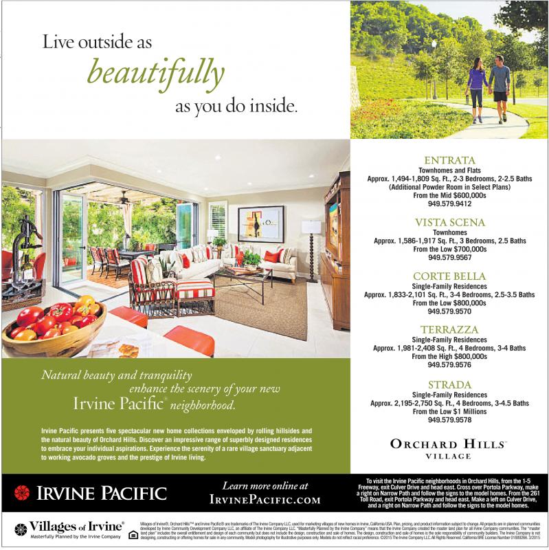 Villages of Irvine®, Orchard Hills™ and Irvine Pacific® are trademarks of The Irvine CompanyLLC,used for marketing villages of new homes in Irvine, California USA. Plan, pricing, and product information subject to change.All projects are in planned communities developed by Irvine Community Development CompanyLLC,anaffiliateofThe Irvine CompanyLLC.“Masterfully Planned by the Irvine Company” means thatthe Irvine Companycreated the master land plan for all Irvine Companycommunities. The “master land plan” includes the overall entitlement and design of each community but does not include the design, construction and sale of homes. The design, construction and sale of homes is the sole responsibility of community builders. The Irvine Companyisnot designing, constructing or offering homes for sale in anycommunity.Model photographyfor illustrative purposes only.Modelsdonot reflect racial preference. ©2015 The Irvine CompanyLLC.All Rights Reserved. California BRE License Number 01889266. 3/2015