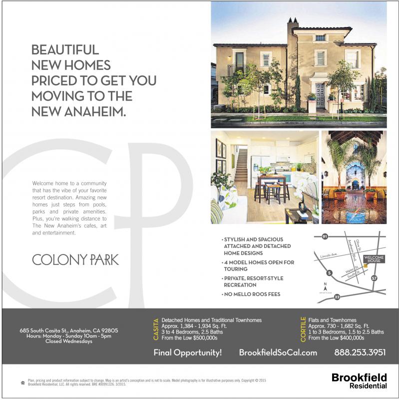 BEAUTIFUL NEW HOMES PRICED TO GET YOU MOVING TO THE NEW ANAHEIM. Welcome home to a community that has the vibe of your favorite resort destination. Amazing new homes just steps from pools, parks and private amenities. Plus, you’re walking distance to The New Anaheim’s cafes, art and entertainment. •STYLISH AND SPACIOUS ATTACHED AND DETACHED HOME DESIGNS •4MODEL HOMES OPEN FOR TOURING •PRIVATE, RESORT-STYLE RECREATION •NOMELLOROOS FEES 91 5 N MAP NOT TO SCALE 22 WELCOME HOUSE 57 685 South Casita St., Anaheim, CA 92805 Hours: Monday -Sunday 10am-5pm Closed Wednesdays Detached Homes and Traditional Townhomes Approx. 1,384 - 1,934 Sq. Ft. 3 to 4 Bedrooms, 2.5 Baths From the Low $500,000s Flats and Townhomes Approx. 730 - 1,682 Sq. Ft. 1 to 3 Bedrooms, 1.5 to 2.5 Baths From the Low $400,000s Final Opportunity! BrookfieldSoCal.com 888.253.3951 Plan, pricing and product information subject to change. Map is an artist’sconception and is not to scale. Model photography is for illustrative purposes only.Copyright ©2015 Brookfield Residential, LLC. All rights reserved. BRE #00991326. 3/2015.