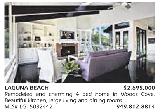 LAGUNA BEACH $2,695,000 Remodeled and charming 4 bed home in Woods Cove. Beautiful kitchen, large living and dining rooms. MLS# LG15032442 949.812.8814