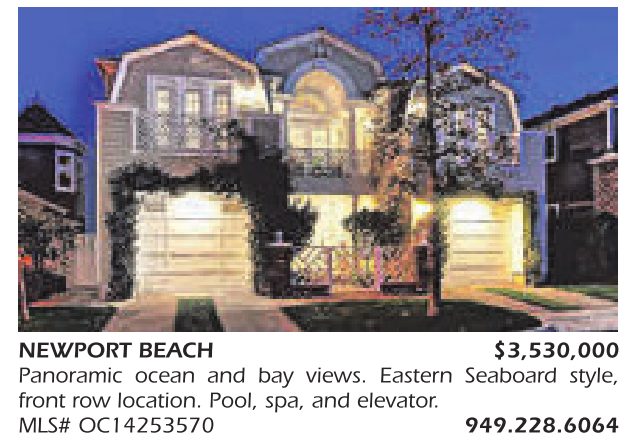 NEWPORT BEACH $3,530,000 Panoramic ocean and bay views. Eastern Seaboard style, front row location. Pool, spa, and elevator. MLS# OC14253570 949.228.6064