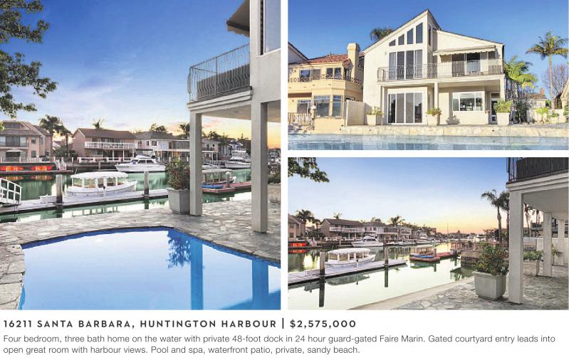 16211 SANTA BARBARA, HUNTINGTON HARBOUR | $2,575,000 Four bedroom, three bath home on the water with private 48-foot dock in 24 hour guard-gated Faire Marin. Gated courtyard entry leads into open great room with harbour views. Pool and spa, waterfront patio, private, sandy beach.