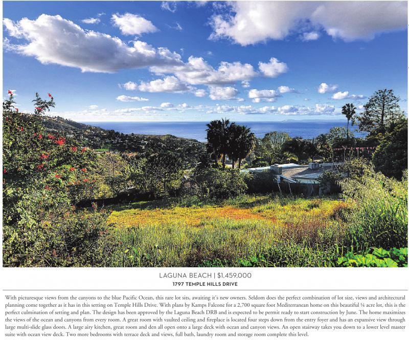 LAGUNA BEACH | $1,459,000 1797 TEMPLE HILLS DRIVE With picturesque views from the canyons to the blue Pacific Ocean, this rare lot sits, awaiting it's new owners. Seldom does the perfect combination of lot size, views and architectural planning come together as it has in this setting on Temple Hills Drive. With plans by Kamps Falcone for a 2,700 square foot Mediterranean home on this beautiful ¼ acre lot, this is the perfect culmination of setting and plan. The design has been approved by the Laguna Beach DRB and is expected to be permit ready to start construction by June. The home maximizes the views of the ocean and canyons from every room. A great room with vaulted ceiling and fireplace is located four steps down from the entry foyer and has an expansive view through large multi-slide glass doors. A large airy kitchen, great room and den all open onto a large deck with ocean and canyon views. An open stairway takes you down to a lower level master suite with ocean view deck. Two more bedrooms with terrace deck and views, full bath, laundry room and storage room complete this level.