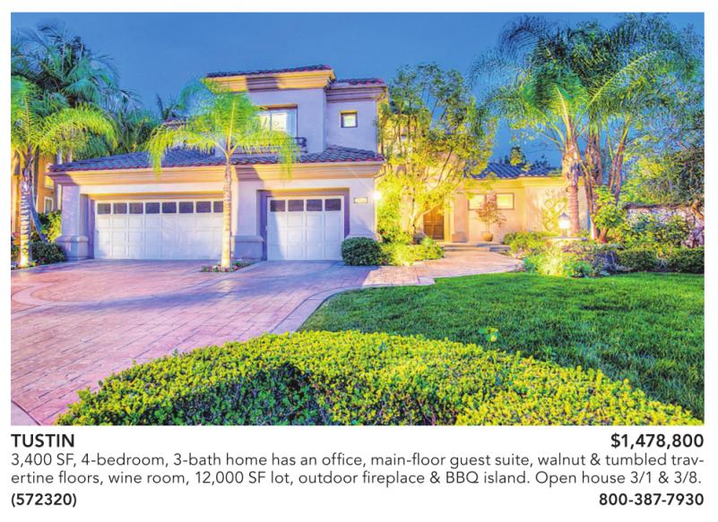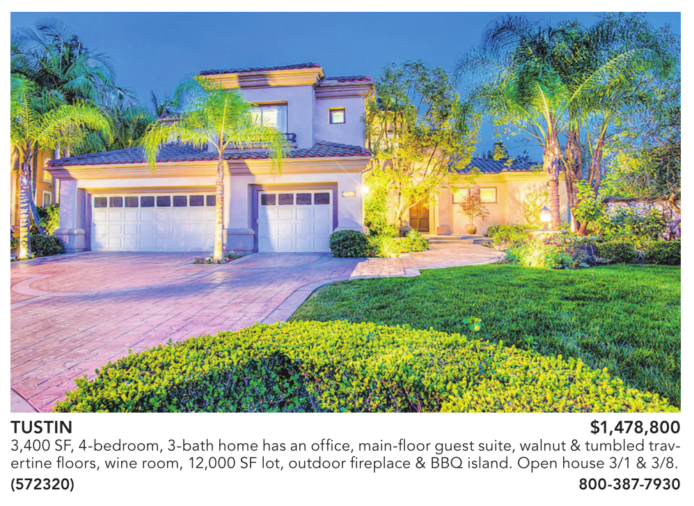 TUSTIN $1,478,800 3,400 SF, 4-bedroom, 3-bath home has an office, main-floor guest suite, walnut & tumbled travertine floors, wine room, 12,000 SF lot, outdoor fireplace & BBQ island. Open house 3/1 & 3/8.