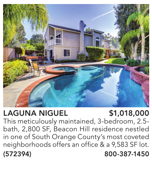 LAGUNA NIGUEL $1,018,000 This meticulously maintained, 3-bedroom, 2.5- bath, 2,800 SF, Beacon Hill residence nestled in oneofSouth Orange County’smostcoveted neighborhoods offers an office&a9,583 SF lot. (572394) 800-387-1450