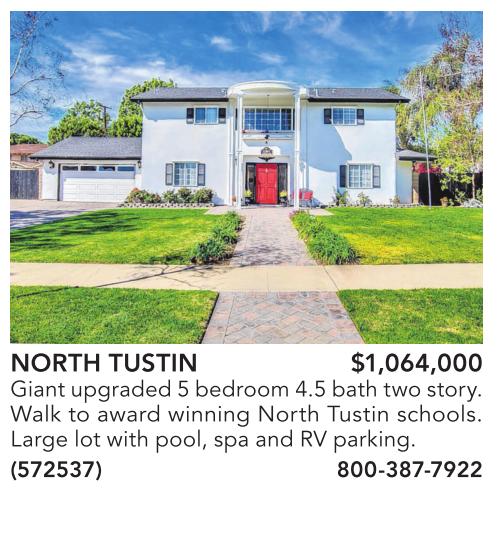 NORTH TUSTIN $1,064,000 Giant upgraded 5bedroom 4.5 bath two story. Walk to award winning North Tustin schools. Large lot with pool, spa and RV parking.