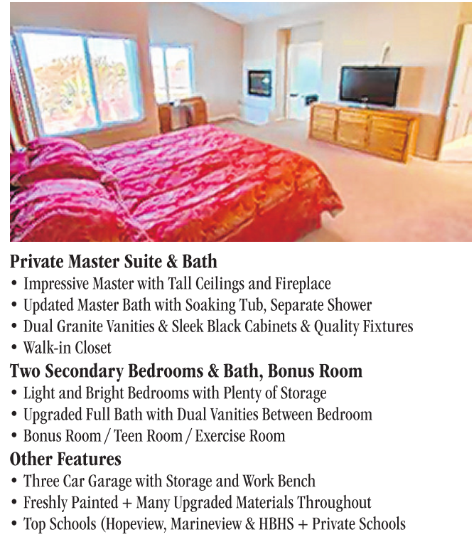 Private Master Suite & Bath • Impressive Master with Tall Ceilings andFireplace • Updated Master Bath with SoakingTub,SeparateShower • DualGranite Vanities &Sleek BlackCabinets&Quality Fixtures • Walk-inCloset Two Secondary Bedrooms & Bath, Bonus Room • Light andBrightBedrooms with Plenty of Storage • UpgradedFullBathwithDualVanitiesBetween Bedroom • Bonus Room /TeenRoom/Exercise Room Other Features • Three CarGaragewithStorage andWorkBench • Freshly Painted+ManyUpgradedMaterials Throughout • Top Schools(Hopeview,Marineview&HBHS +Private Schools