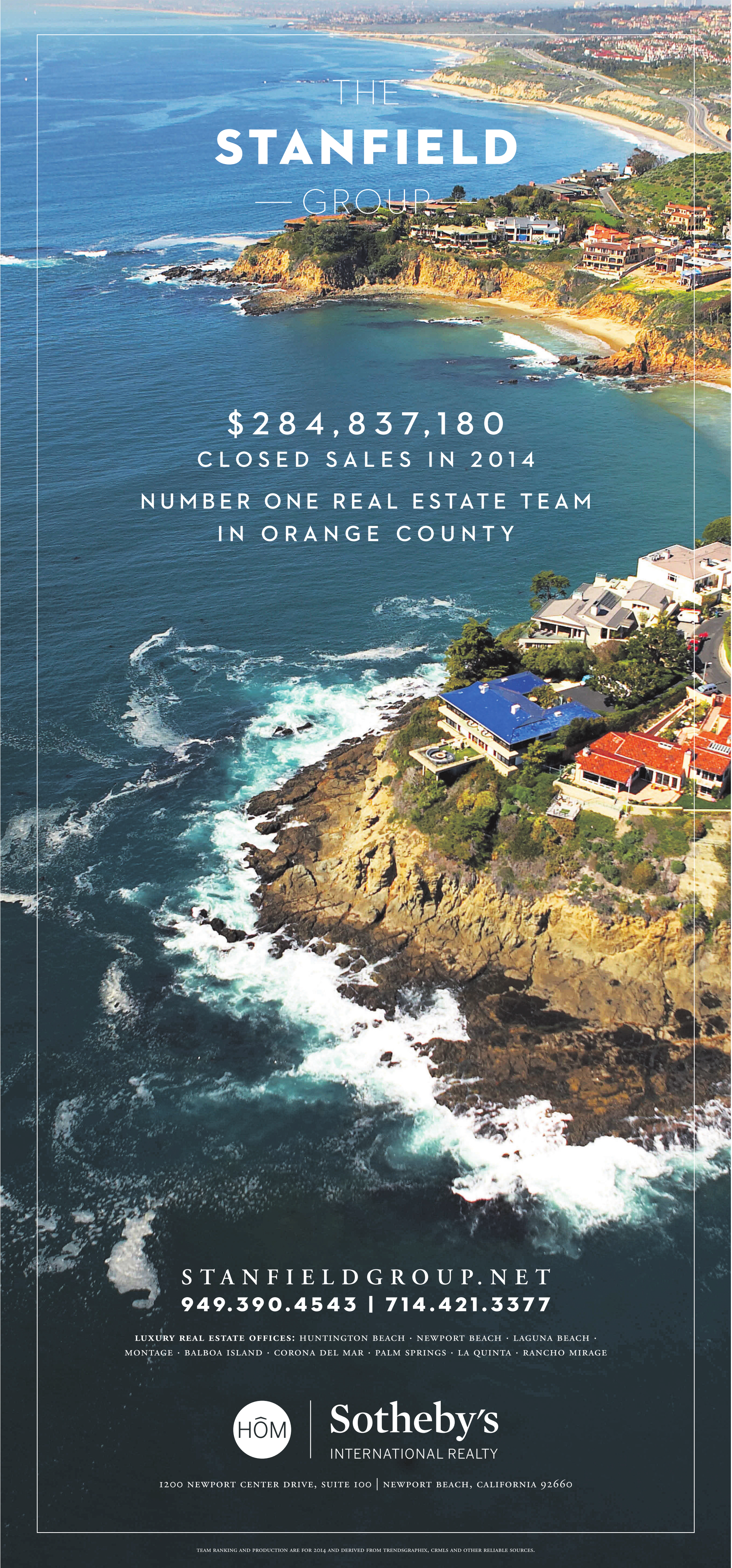$2 8 4 , 8 3 7 , 1 8 0 C L O S E D S A L E S I N 2 0 1 4 N U M B E R O N E R E A L E S T A T E T E A M I N O R A N G E C O U N T Y S T A N F I E L D G R O U P . N E T 9 4 9. 3 9 0 . 4 5 4 3 | 7 1 4 . 4 2 1 . 3 3 7 7 luxury real estate offices: huntington beach · newport beach · laguna beach · montage · balboa island · corona del mar · palm springs · la quinta · rancho mirage 1200 newport center drive, suite 100 | newport beach, california 92660 team ranking and production According to informationpublished are 2014 and derived by The Wall from Street trendsgraphix, Journal for the time crmls period andofother 2012 reliable sources.