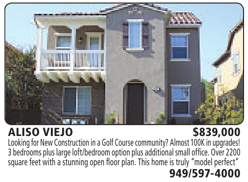 ALISO VIEJO $839,000 Looking forNew Construction in aGolfCourse community? Almost 100K in upgrades! 3bedrooms plus large loft/bedroomoptionplusadditionalsmall office. Over 2200 square feet with astunningopenfloorplan. This home is truly “modelperfect” 949/597-4000