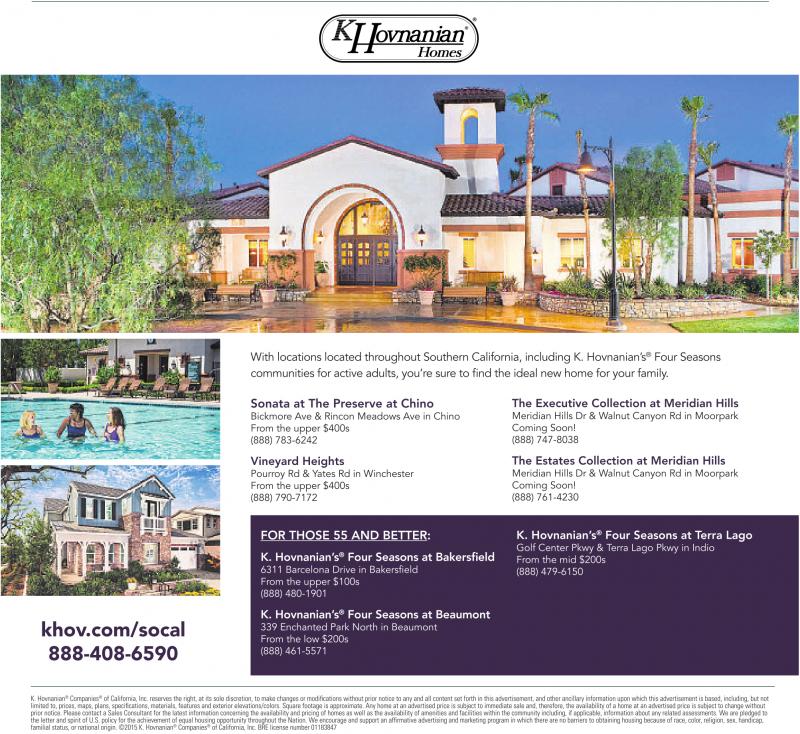 K. Hovnanian ® Companies ® of California, Inc. reserves the right, at its sole discretion, to make changes or modifications without prior notice to any and all content set forth in this advertisement, and other ancillary information upon which this advertisement is based, including, but not limited to, prices, maps, plans, specifications, materials, features and exterior elevations/colors. Square footage is approximate. Any home at an advertised price is subject to immediate sale and, therefore, the availability of ahome at an advertised price is subject to change without prior notice. Please contact aSales Consultant for the latest information concerning the availability and pricing of homes as well as the availability of amenities and facilities within the community including, if applicable, information about any related assessments. We arepledged to theletter and spirit of U.S. policy for the achievement of equal housing opportunity throughout the Nation. We encourageand support an affirmative advertising and marketing program in which there are no barriers to obtaining housing because of race, color,religion, sex, handicap, familial status, or national origin. ©2015 K. Hovnanian ® Companies ® of California, Inc. BRE license number 01183847