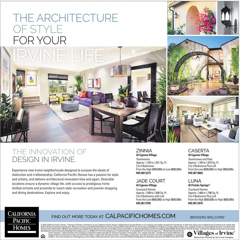 ©2015California Pacific Homes. *Payment of Broker commission at any California Pacific Homes neighborhood requires Broker to accompany and register prospective homebuyer on their first visit to each neighborhood of interest and comply with Seller’sBrokerCooperation Agreement. All buyers must be prequalified with California Pacific Homes preferred lender.Pricesand product availability are subject to change without notice. As aresident of Irvine you automatically become amember of the Homeowner’sAssociation. Monthly association dues maintain the quality of common area facilities. Irvine is included in an Assessment District and Community Facilities (Mello Roos) District. Portola Springs ® andCypress Villageare planned communities developed by Irvine Community Development Company LLC, an affiliate of The Irvine Company LLC. Portola Springs ® is atrademark of The Irvine Company LLC. “Masterfully Planned by the Irvine Company” means that the Irvine Company created the master land plan for all Irvine Company communities. The “master land plan” includes the overall entitlement and design of each community but does not include the design, construction and sale of homes. The design, construction and sale of homes is the sole responsibility of community builders. The Irvine Company is not designing, constructing or offering homes for sale in any community.Model photography for illustrative purposes only.BRE license #01277135.