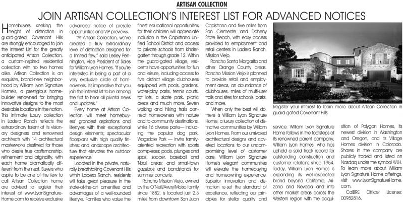 “At Artisan Collection, we’ve created a truly extraordinary level of distinction designed for a limited few,” said Lesley Pennington, vice President of Sales for William Lyon Homes. “If you’re interested in being a part of avery exclusive circle of homeowners,it’s imperativethat you join the interest list to be among the first to hear all pivotal news and updates.”
