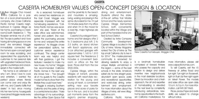 Maggie Choi moved to California for a position at a local pharmaceutical company, she chose California Pacific Homes’ Caserta neighborhood in Cypress Village as her home, purchasing a 2 bedroom/2-bath Residence 1. “This floorplan reminds me of a NYC flat. The size is perfect and Ilove having all my living spaceonone level,” she remarked. Maggie immediately connected with the home’s open-concept great room for easy socializing, and appreciated the opportunity to customize to her personal style with upgraded hardwood floors, granite countertops and abacksplashinthe master bath.