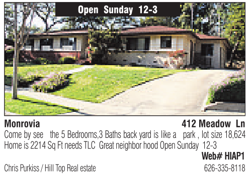Comebysee the 5Bedrooms,3 Baths back yardislike a park,lotsize18,624 Home is 2214SqFtneeds TLC Great neighbor hood Open Sunday 12-3 Web# HIAP1 ChrisPurkiss /Hill TopReal estate 626-335-8118