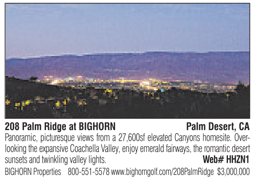 208 Palm Ridge at BIGHORN Palm Desert, CA BIGHORN Properties 800-551-5578 www.bighorngolf.com/208PalmRidge $3,000,000 Panoramic, picturesque views from a27,600sf elevated Canyons homesite. Overlooking the expansiveCoachella Valley,enjoy emerald fairways,the romantic desert sunsets and twinklingvalleylights. Web# HHZN1