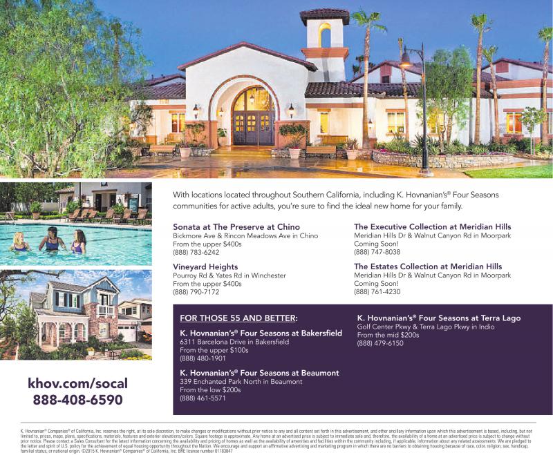 K. Hovnanian ® Companies ® of California, Inc. reserves the right, at its sole discretion, to make changes or modifications without prior notice to any and all content set forth in this advertisement, and other ancillary information upon which this advertisement is based, including, but not limited to, prices, maps, plans, specifications, materials, features and exterior elevations/colors. Square footage is approximate. Any home at an advertised price is subject to immediate sale and, therefore, the availability of ahome at an advertised price is subject to change without prior notice. Please contact aSales Consultant for the latest information concerning the availability and pricing of homes as well as the availability of amenities and facilities within the community including, if applicable, information about any related assessments. We arepledged to theletter and spirit of U.S. policy for the achievement of equal housing opportunity throughout the Nation. We encourageand support an affirmative advertising and marketing program in which there are no barriers to obtaining housing because of race, color,religion, sex, handicap, familial status, or national origin. ©2015 K. Hovnanian ® Companies ® of California, Inc. BRE license number 01183847