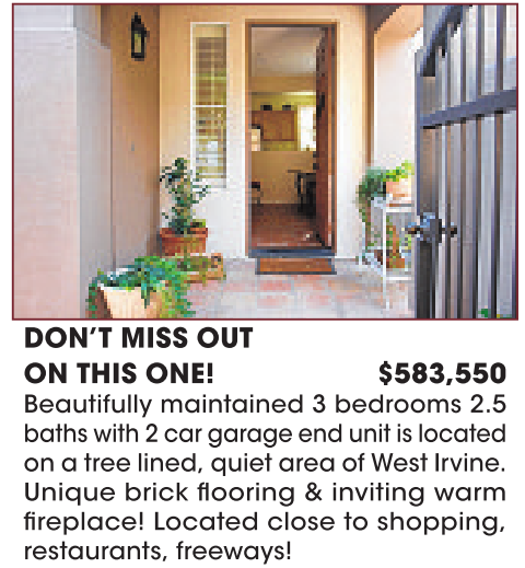 DON’T MISS OUT ON THIS ONE! $583,550 Beautifully maintained 3 bedrooms 2.5 bathswith 2car garageend unit is located on a tree lined, quiet area of West Irvine. Unique brick flooring & inviting warm fireplace! Located close to shopping, restaurants, freeways!
