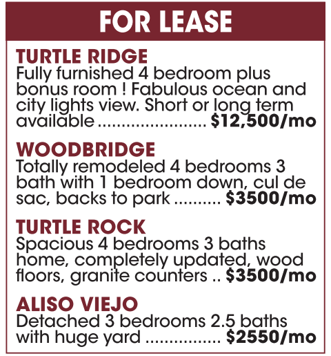 FOR LEASE TURTLE RIDGE Fully furnished 4 bedroom plus bonus room ! Fabulous ocean and city lights view. Short or long term available ....................... $12,500/mo WOODBRIDGE Totally remodeled 4 bedrooms 3bath with 1 bedroom down, cul de sac, backs to park.......... $3500/mo TURTLE ROCK Spacious 4 bedrooms 3 baths home, completely updated, wood floors, granite counters ..$3500/mo ALISO VIEJO Detached 3 bedrooms 2.5 baths with huge yard ................ $2550/mo