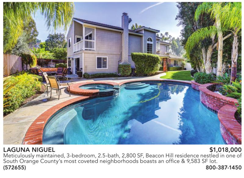LAGUNA NIGUEL $1,018,000 Meticulously maintained,3-bedroom,2.5-bath, 2,800SF, BeaconHill residencenestled in oneof South Orange County’s most coveted neighborhoods boasts an office & 9,583 SF lot. (572655) 800-387-1450