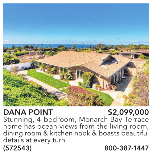 DANA POINT $2,099,000 Stunning, 4-bedroom, Monarch Bay Terrace home has ocean views from the living room, dining room & kitchen nook & boasts beautiful details at every turn. (572543) 800-387-1447