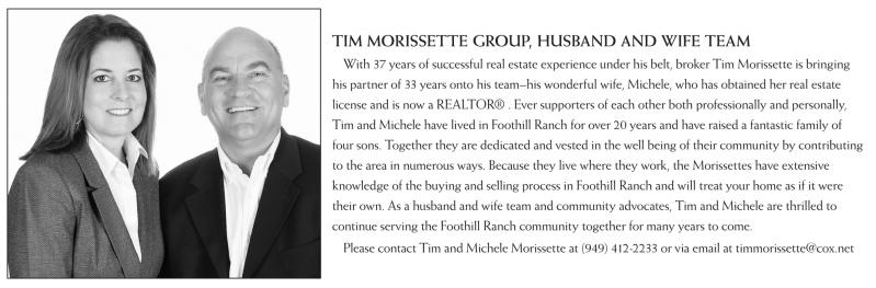 TIM MORISSETTE GROUP, HUSBAND AND WIFE TEAM With 37 years of successful real estate experience under his belt, broker Tim Morissette is bringing his partner of 33 years onto his team–his wonderful wife, Michele, who has obtained her real estate license and is now a REALTOR® . Ever supporters of each other both professionally and personally, Tim and Michele have lived in Foothill Ranch for over 20 years and have raised a fantastic family of four sons. Together they are dedicated and vested in the well being of their community by contributing to the area in numerous ways. Because they live where they work, the Morissettes have extensive knowledge of the buying and selling process in Foothill Ranch and will treat your home as if it were their own. As a husband and wife team and community advocates, Tim and Michele are thrilled to continue serving the Foothill Ranch community together for many years to come. Please contact Tim and Michele Morissette at (949) 412-2233 or via email at timmorissette@cox.net