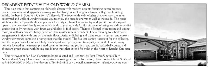 DECADENT ESTATE WITH OLD WORLD CHARM This is an estate that captures an old world charm with modern accents featuring ocean breezes, modern amenities and upgrades, making you feel like you are living in a Tuscan village while sitting amidst the best in Southern California’s lifestyle. The foyer with walls of glass that overlook the inner courtyard and walls of windows invite you to enjoy the outside charms as well as the inside. The open kitchen features top-of-the-line appliances, Euro styled frameless cabinetry and granite countertops all open to the oversized family room which leads to your outside California room offering an additional 484 square feet of living space with fireplace and glass bi-fold doors. There is a formal living room and dining room, as well as a private library or office. The master suite is decadent. The remaining four bedrooms are generous in size with one on the main floor. Designer lighting and paint, security system and custom window coverings complete a home finer that the model. The five-car garage is perfect for the collector, and the large corner lot is beautifully landscaped with privacy and tranquility in mind. This stunning home is located in the master planned community featuring picnic areas, tennis, basketball courts, and abundant green spaces with hiking and biking trails that extend for miles in the heart of Rancho San Juan Park. This extravagant San Juan Capistrano home is listed at $1,345,000 by First Team® agents Terri Newland and Mary Henderson. For a private showing or more information, please contact Terri Newland at 714-906-6060 or Mary Henderson at 714-342-4312 or via email at maryandterri@enjoyocliving.com