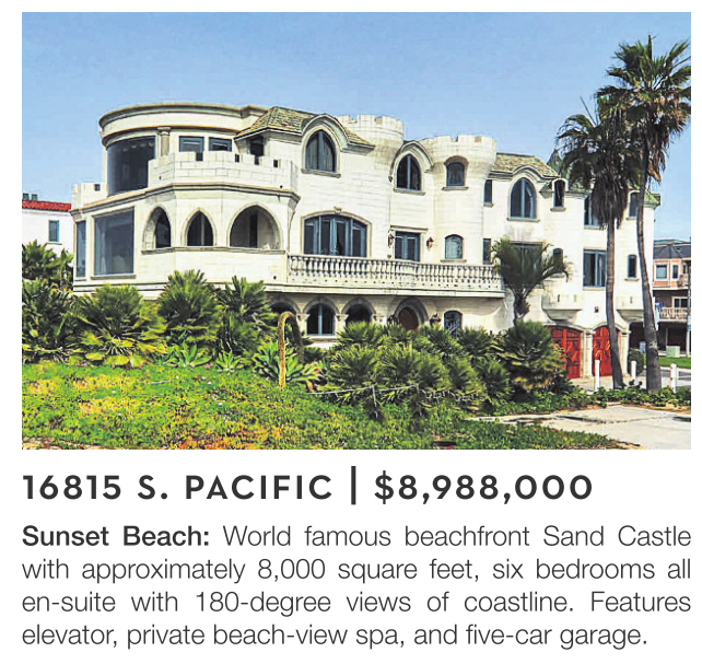 Sunset Beach: World famous beachfront Sand Castle with approximately 8,000 square feet, six bedrooms all en-suite with 180-degree views of coastline. Features elevator, private beach-view spa, and five-car garage.