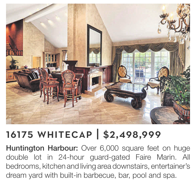 Huntington Harbour: Over 6,000 square feet on huge double lot in 24-hour guard-gated Faire Marin. All bedrooms, kitchen and living area downstairs, entertainer’s dream yard with built-in barbecue, bar, pool and spa.