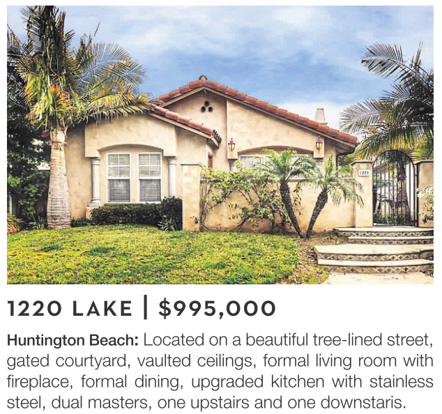 Huntington Beach: Located on a beautiful tree-lined street, gated courtyard, vaulted ceilings, formal living room with fireplace, formal dining, upgraded kitchen with stainless steel, dual masters, one upstairs and one downstaris.