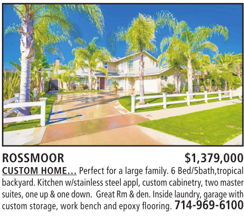 backyard. Kitchen w/stainless steel appl,customcabinetry, twomaster suites, oneup&one down. Great Rm &den.Insidelaundry, garagewith custom storage, work bench and epoxy flooring. 714-969-6100 ROSSMOOR $1,379,000 CUSTOM HOME… Perfect for alarge family. 6Bed/5bath,tropical