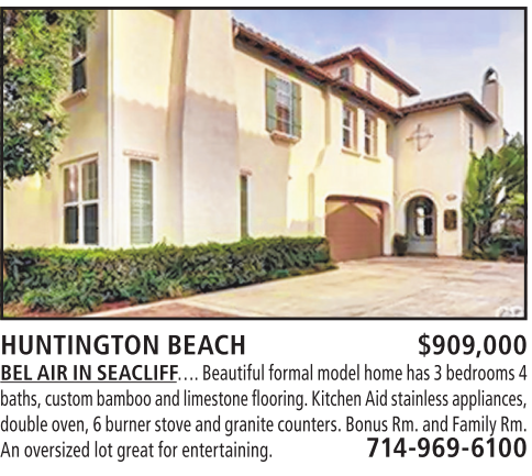 HUNTINGTON BEACH $909,000 BEL AIR IN SEACLIFF…. Beautifulformalmodel home has 3bedrooms 4 baths, custombamboo andlimestone flooring.Kitchen Aidstainless appliances, double oven, 6burnerstove andgranitecounters. Bonus Rm.and Family Rm. An oversizedlot great forentertaining. 714-969-6100