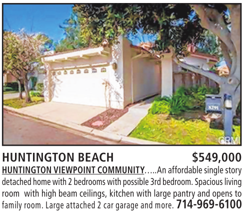 detachedhomewith2bedrooms with possible 3rdbedroom. Spacious living HUNTINGTON BEACH $549,000 HUNTINGTONVIEWPOINT COMMUNITY…..Anaffordable singlestory room with high beam ceilings, kitchen with large pantry and opens to family room.Large attached 2car garage and more. 714-969-6100