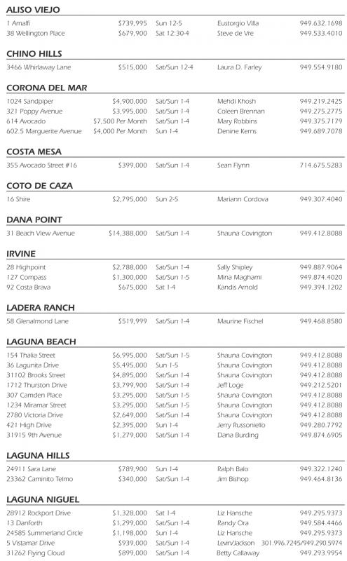 LAGUNA BEACH 154 Thalia Street $6,995,000 Sat/Sun 1-5 Shauna Covington 949.412.8088 36 Lagunita Drive $5,495,000 Sun 1-5 Shauna Covington 949.412.8088 31102 Brooks Street $4,895,000 Sat/Sun 1-4 Shauna Covington 949.412.8088 1712 Thurston Drive $3,799,900 Sat/Sun 1-4 Jeff Loge 949.212.5201 307 Camden Place $3,295,000 Sat/Sun 1-5 Shauna Covington 949.412.8088 1234 Miramar Street $3,295,000 Sat/Sun 1-5 Shauna Covington 949.412.8088 2780 Victoria Drive $2,649,000 Sat/Sun 1-4 Shauna Covington 949.412.8088 421 High Drive $2,395,000 Sun 1-4 Jerry Russoniello 949.280.7792 31915 9th Avenue $1,279,000 Sat/Sun 1-4 Dana Burding 949.874.6905
