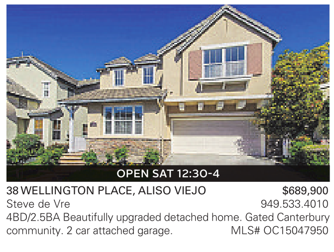 38 WELLINGTON PLACE, ALISO VIEJO $689,900 Steve de Vre 949.533.4010 4BD/2.5BA Beautifully upgraded detached home. Gated Canterbury community. 2 car attached garage. MLS# OC15047950