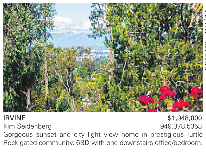 IRVINE $1,948,000 Kim Seidenberg 949.378.5353 Gorgeous sunset and city light view home in prestigious Turtle Rock gated community. 6BD with one downstairs office/bedroom.