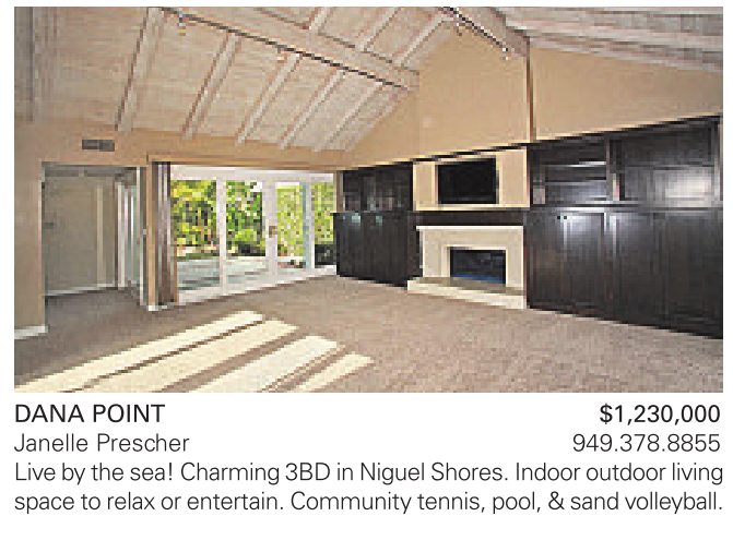 DANA POINT $1,230,000 Janelle Prescher 949.378.8855 Livebythe sea! Charming 3BD in Niguel Shores. Indoor outdoor living space to relax or entertain. Communitytennis, pool, &sand volleyball.