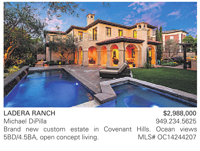 LADERA RANCH $2,988,000 Michael DiPilla 949.234.5625 Brand new custom estate in Covenant Hills. Ocean views 5BD/4.5BA, open concept living. MLS# OC14244207